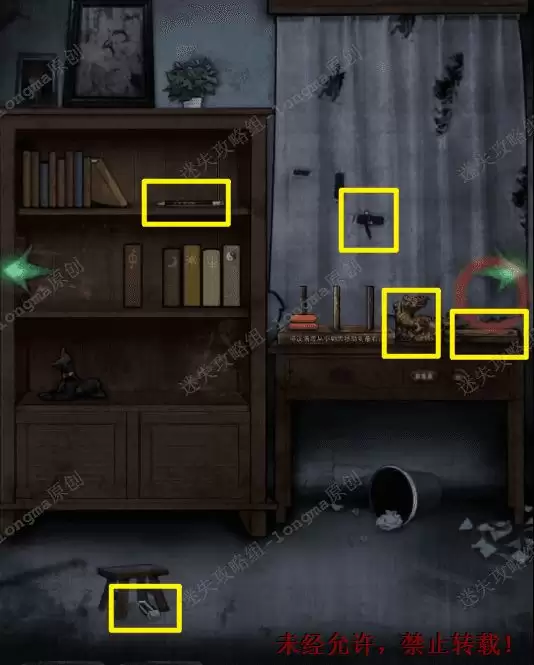 36.向右来到书架房间,在书架上获得【铅笔】,地上获得【橡皮】,桌子上获得【生肖•龙】,窗帘上获得【圆珠笔】,铅笔盒中获得【生肖•牛】,将【铅笔】【橡皮】【圆珠笔】放入铅笔盒中。36