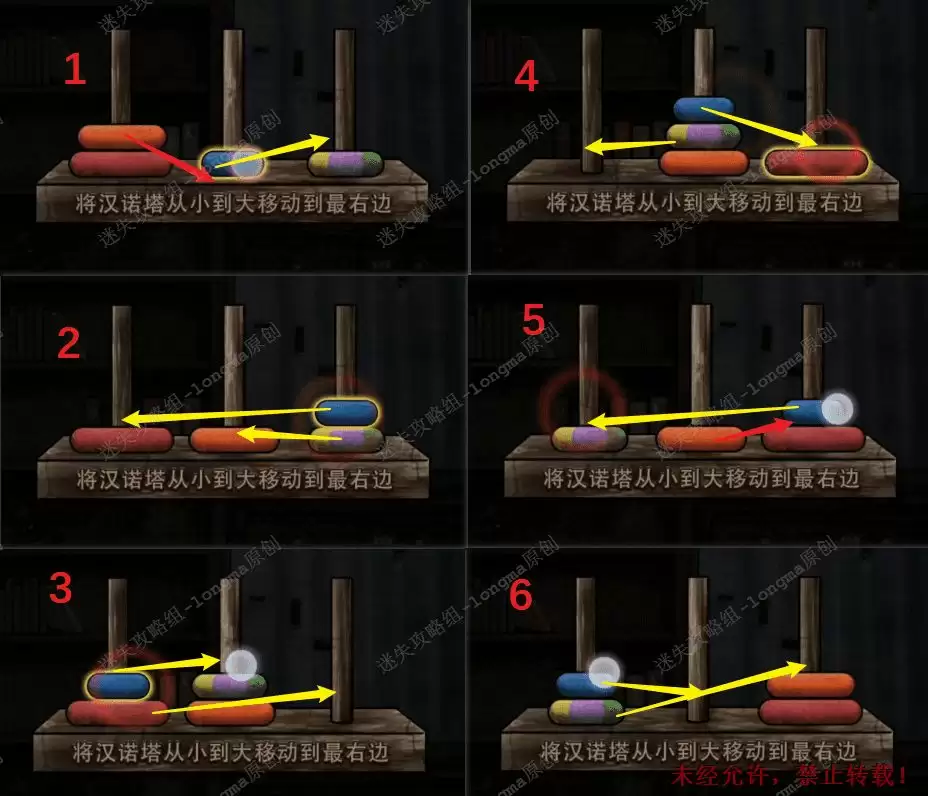 45.将【蓝色圆环】和【彩色圆环】放入桌子上的汉诺塔上,完成汉诺塔游戏(如图45.1),得到【老旧的钥匙】。45 45.1