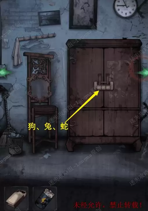 54.来到衣柜房间,在衣柜的锁上输入生肖狗、兔、蛇,打开柜子,第三章结束。54