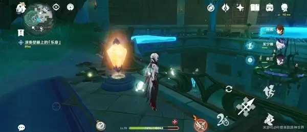 通过击打机关,机关颜色从蓝色转变为黄色,即可乘坐水梯,到达指定位置。