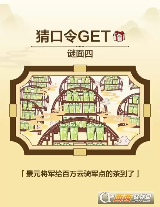 第四关:口令提示:景元将军给百万云骑将军点的茶到了!