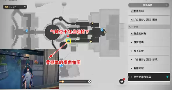 2、进入后前走至红地毯桥上,往右看,就能看到气球了。
