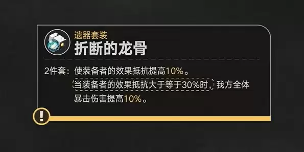 效果:使装备者的效果抵抗提高10%,当装备者的效果抵抗大于等于30%时,我方全体暴击伤害提高10%。