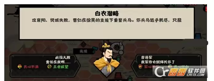 3、我们需要走完白衣潜略的任务才能进入史实结局,因为之前遗留的事件不较多,需要一个个点。主线事件随便选,随机事件选择没有后续的选项。白衣潜略事件到了一定阶段会变成自动跳出来,这个时候就不用再点事件了,完成最后一环之后进入结局。