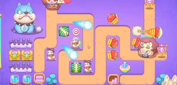4、右边可以建造陀螺炮塔来补输出,然后左边要加大火力,打掉坏狗。