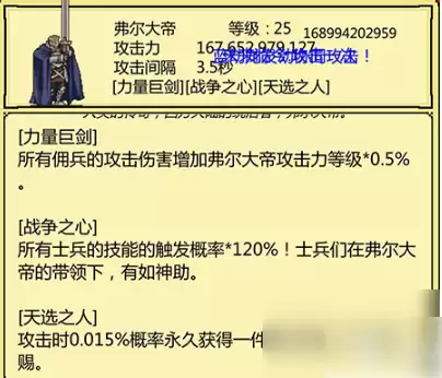 所有士兵的技能的触发概率*120%!士兵们在弗尔大帝的带领下如有神助。