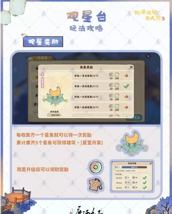 7、每收集齐一个星象就可以领一次奖励,累计集齐5个星象可获得建筑·[星莹月裳],观星升级后可以领取奖励。