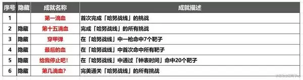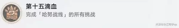 (1)《哈努战线》小游戏一共有15个关卡,完成第1个关卡后,即可获得成就《第一滴血》,完成全部15个关卡后,即可获得隐藏成就《第十五滴血》