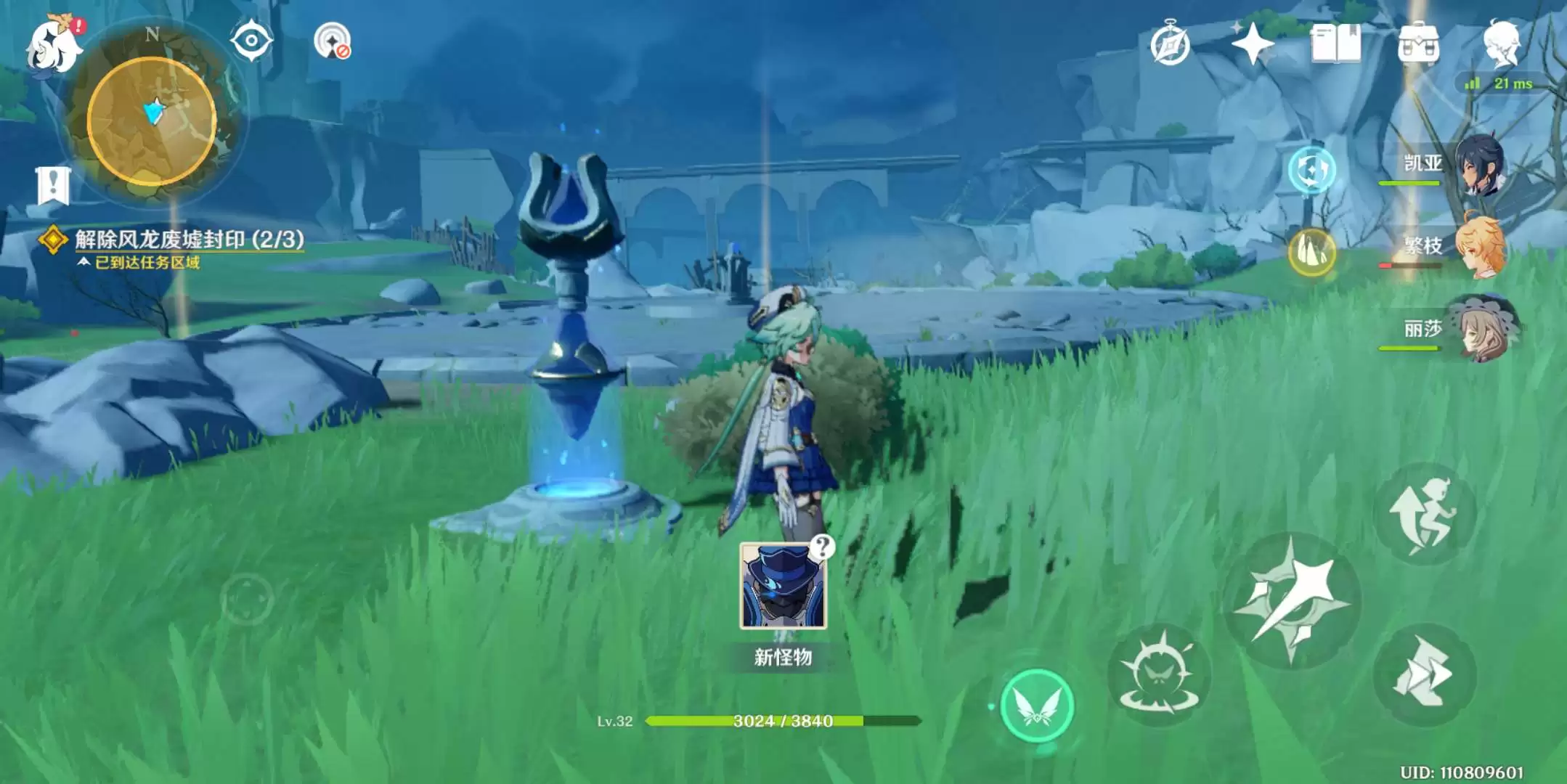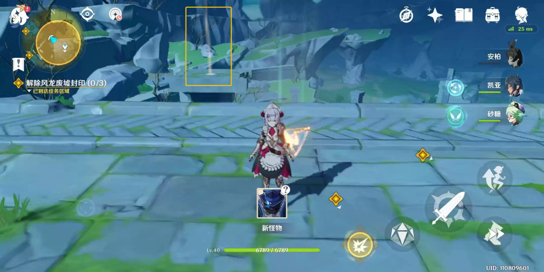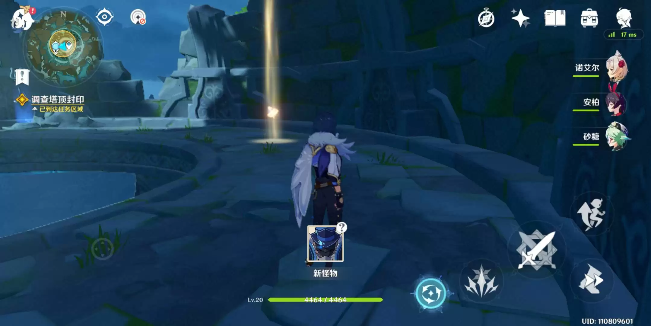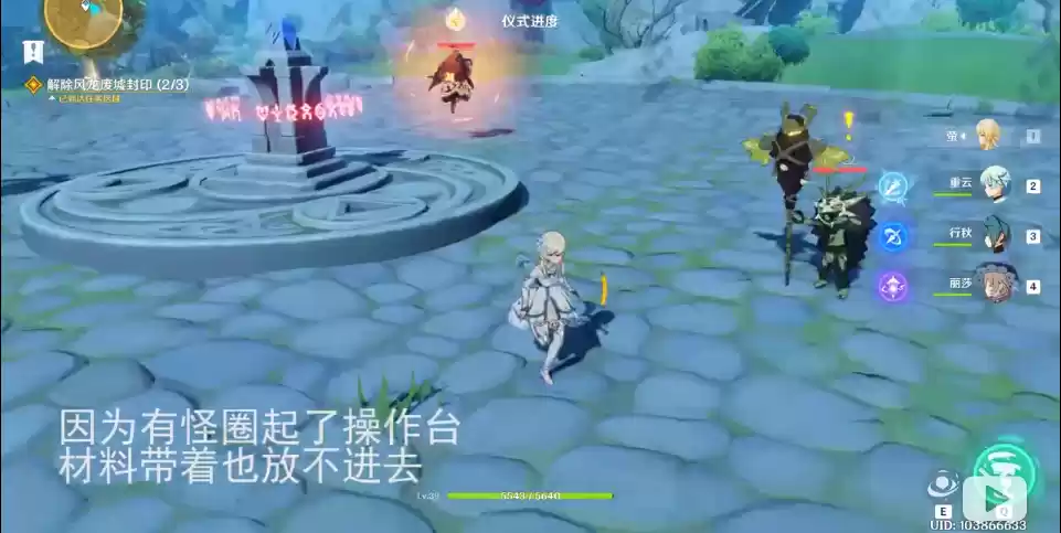 1、我们可以看到塔顶是被封印的,并且封印并不在塔顶,在塔的第二层,有迪卢克、琴、温迪的那一层,下图所示发着光的就是封印了,将封印放到操作台上,即可与温迪对话,接取任务。