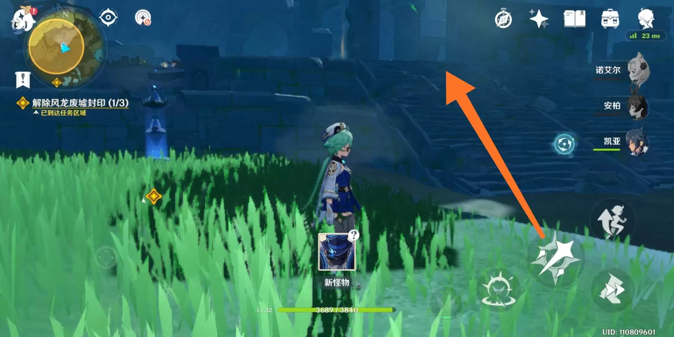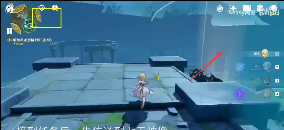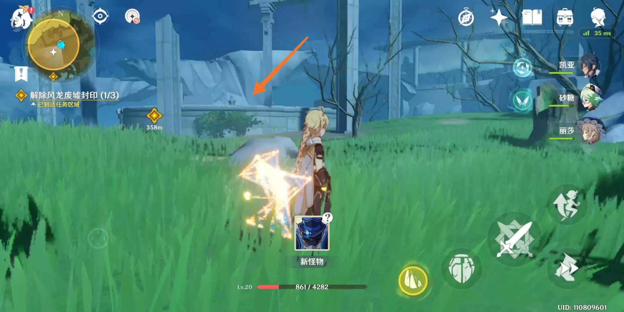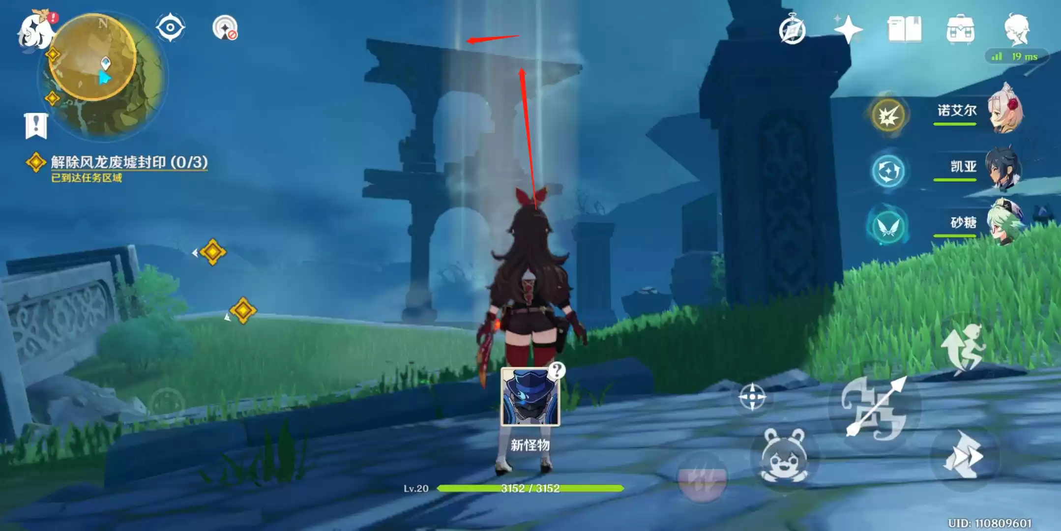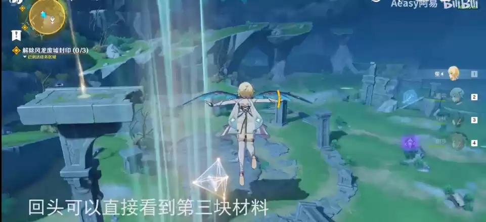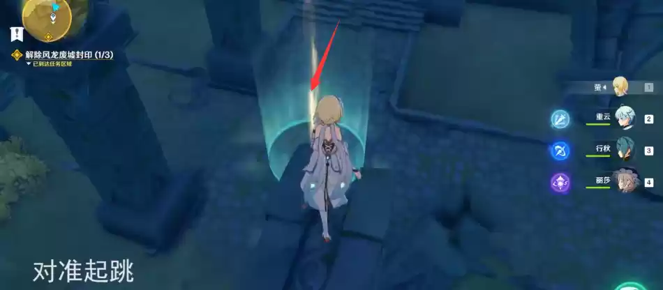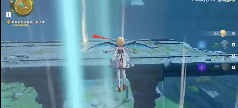 3、走到下图标记的位置,借助风场到任务提示的最右边区域,到了之后先解锁传送锚点,接着去寻找光点。