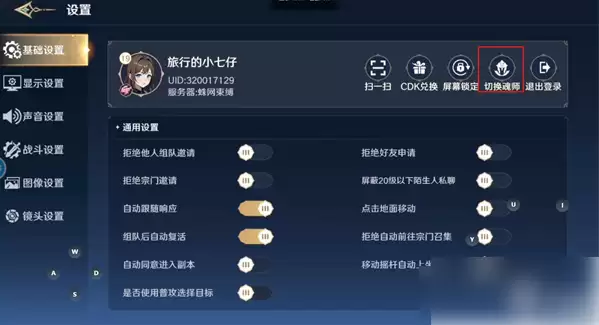 3、在设置的页面中我们可以看到有扫一扫、兑换、屏幕锁定、切换魂师、退出登录功能,点击【切换魂师】;