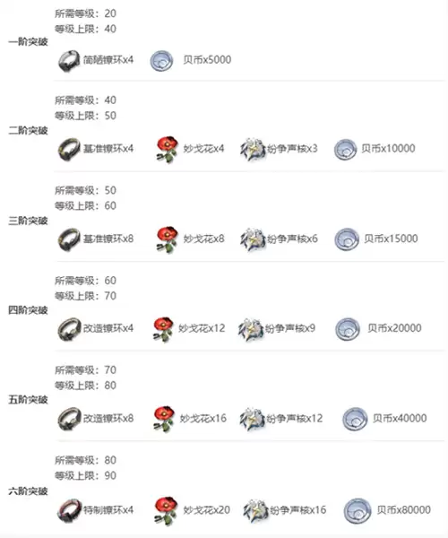 6、六阶突破:特制镣环x4、妙戈花x20、纷争声核x16、贝币x80000