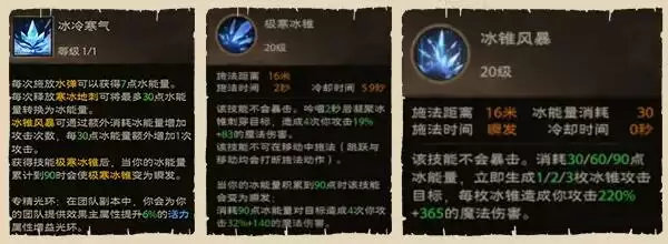 冰锥风暴:该技能不会暴击。消耗30/60/90点冰能量,立即生成1/2/3枚冰锥攻击目标,每枚冰锥造成你攻击220%+365的魔法伤害。