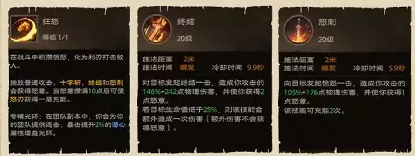 狂怒:在战斗中积攒愤怒,化为利刃打击敌人。施放普通攻击、十字斩、终结和怒刺会获得怒意。当怒意攒满10点后可使怒刃获得一层充能。