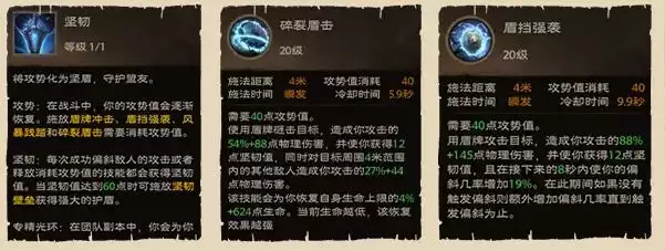 碎裂盾击:需要40点攻势值,使用盾牌旺击目标,造成你攻击的549%+88点物理伤善,并使你获得12点坚韧值,同时对自标周图4米范围内的其他敌人造成你攻击的27%+44点物理伤害。