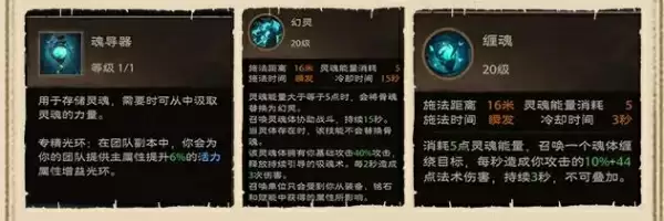 缠魂:消耗5点灵魂能量,召唤一个魂体缠绕目标,每秒造成你攻击的10%6+44点法术伤害,持续3秒,不可叠加。