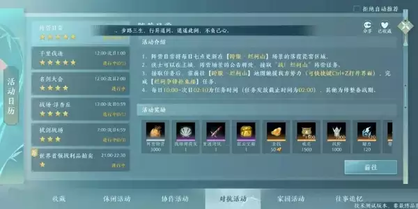 走PVP路线的玩家,主要看【对抗活动】这一页的全部日常。其中【阵营日常】【千里伐逐】以及【战场】属于是阵营任务;【名剑大会】以及【拭剑战场】属于不需要加入阵营就可以参加的PVP玩法。