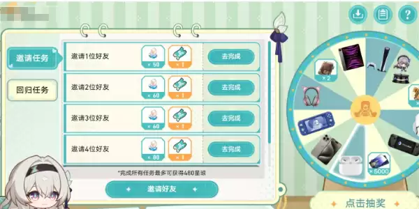 1.开拓者邀约4位回归开拓者,并完成所有网页任务,开拓者共可获得星琼*480及12次抽奖机会。