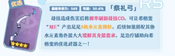 战技造成伤害后将概率刷新战技CD,可让希格雯“双E”产出足足8枚水元素微粒,后续如果搭配其他水元素角色能大大缓解其充能需求,是治疗辅助向希格雯的优选武器之—。