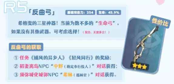 反曲弓可以通过任务《捕风的异乡人》《轻风同行》奖励;稻妻离岛NPC“中野(勘定奉行役人)”对话;须弥城化城郭NPC“希琳(巡林官)”对话获得。