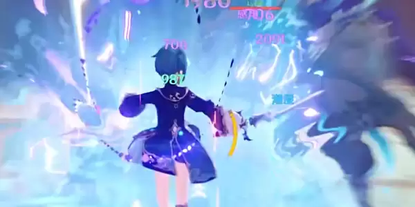 3、然后切换角色为行秋,释放大招和e技能进行大范围挂水,并打出水元素伤害。