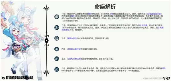 二命:元素战技和元素爆发施放的时候获得护盾直到技能施放完成,并且元素战技和元素爆发的攻击命中敌人降低其水元素抗性。