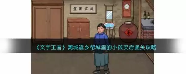 文字王者是一款以文字解谜和寻物为主要玩法的小游戏,其中关卡离城返乡怎么过?这一关需要帮城里的小孩买房,具体如何操作呢?下面是小编给大家带来的小游戏《文字王者》离城返乡帮城里的小孩买房通关攻略,没有过关的小伙伴可以参考一下。