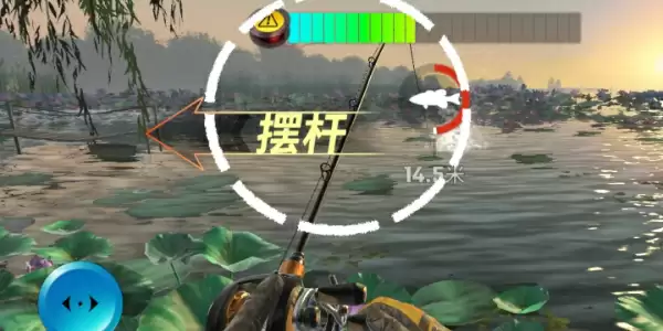 鱼在收线的过程中会比较紧张,从而左右极速游动,玩家这时需要通过屏幕左侧的摆竿按钮进行左右滑动,同时每完成一次摆竿,就填充一次屏幕下方的爆气值。