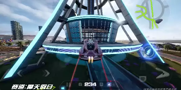 6.在赛道的最后,玩家可以利用弹跳装置穿过大楼抄近点路线,这样可以更快的抵达终点。