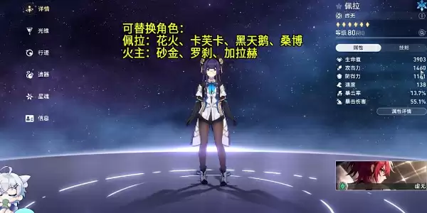 3.佩拉的战技和大招可以为黄泉增加负面效果,且对敌人造成冰属性伤害并提高队友的攻击力;卡芙卡的追击伤害、战技和大招都可以为黄泉挂负面效果。