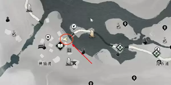1.玩家首先打开地图来到神仙渡右侧的一处酒棚,位置如下图所示。