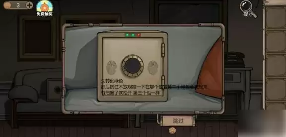 然后开保险柜,先转到绿色,然后按住不放观察一下在哪个位置第二个绿色会亮起来有把握了就松开,第三个也一样,这个箱子就看手速。