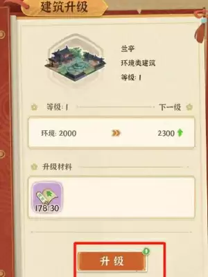 2、点击兰亭建筑后进入建筑升级界面,在升级界面中玩家需要准备好对应的升级材料,当一切准备完成后就可以点击下方【升级】按钮。