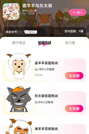 3、进入活动挑战中,玩家可以选择进入“喜羊羊答题挑战”,“灰太狼答题挑战”,“懒洋洋答题挑战”等答题挑战中。