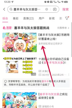 2、在搜索结果界面我们找到“【喜羊羊与灰太狼】答题同好圈重磅上线!”。
