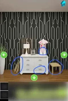 梳妆台旁边木凳和球棒;梳妆台上的内衣;梳妆台右下角的抽屉中的电钻