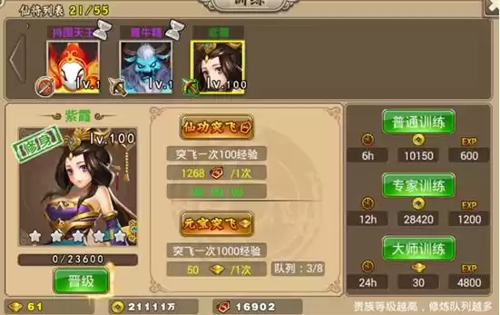 推图闯关所得经验只提升主角等级,仙将的等级需要单独进行训练。仙将的训练可分为:普通训练、专家训练、大师训练,游戏内各有说明。如果想快速提升仙将的等级,可以使用仙功突飞和元宝突飞。