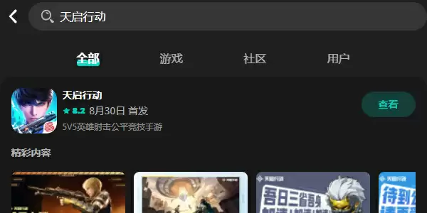 2.安装完成以后点击进入软件,随后在上方搜索栏搜索天启行动,点击查看。