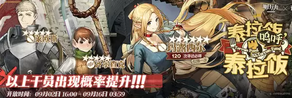 在2024年09月02日16:00~2024年09月16日03:59期间,活动期间【泰拉饭,呜呼,泰拉饭】限时寻访开启,该寻访中以下干员获得概率提升★★★★★:玛露西尔(占6★出率的50%)★★★★★:莱欧斯/齐尔查克(占5★出率的50%)。