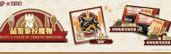活动期间将开放「泰拉饭」活动关卡,玩家可通过活动关卡作战、完成相关活动任务以及活动商店获取相关活动奖励。