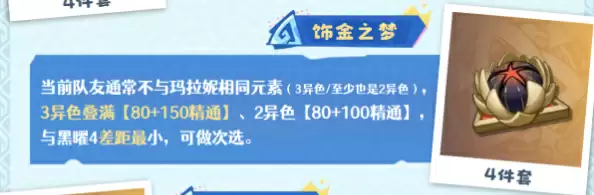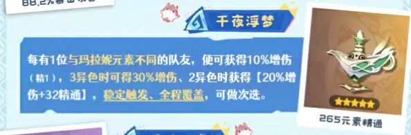 每有1位与玛拉妮元素不同的队友,便可获得10%增伤(精1),3异色时可得30%增伤、2异色时获得【20%增伤+32精通】,稳定触发、全程覆盖,可做次选。