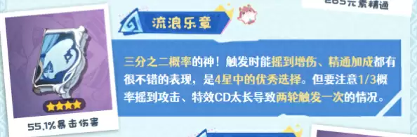 武器被动触发时能摇到增伤、精通加成都有很不错的表现,是4星中的优秀选择。但要注意1/3概率摇到攻击、特效CD太长导致两轮触发一次的情况。
