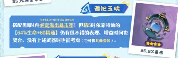 搭配黑曜4件必定溢出暴击率,但精5时依靠特效的【64%生命+80精通】仍有很不错的表现,增益时间也契合,没有上述武器时也能考虑。