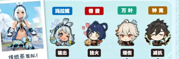 解析:该阵容是目前表现很棒的组合,增伤、减抗都有,效果稳定。优先钟离,可换卡齐娜;优先万叶,可换砂糖。