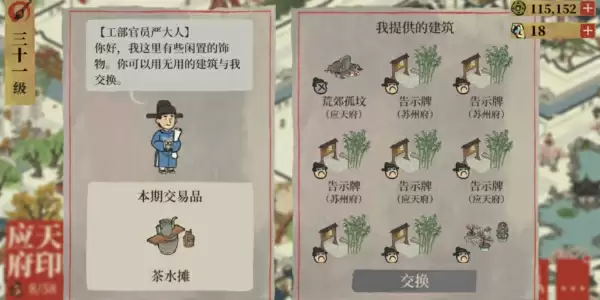 严大人对某些特定物品有更高的偏好,如竹林花园、百年银杏、荷花池、玲珑棋局、喜笑严开旗等,这些物品的积分较高,可以用来换取更高级的建筑。