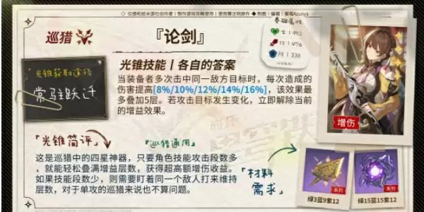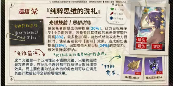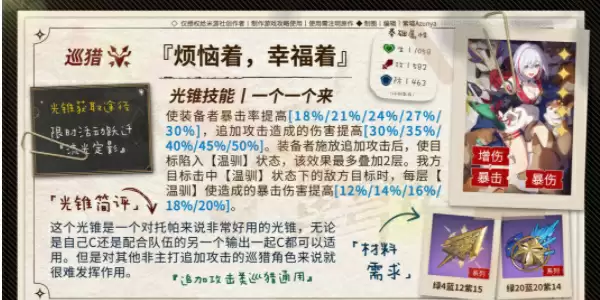 拥有高额的爆伤和增伤加成,释放终结技后可以进一步增伤并且追加攻击无视防御力,可谓是增伤最高了,缺点当然也明显,需要叠三层负面,在飞霄队伍中,貊泽的【猎物】可以算一层,剩下的两层需要砂金来叠。