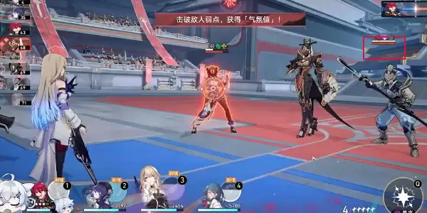 4、进入战斗我们优先使用对应的弱点角色击破旁边小怪的盾,只要击破小怪的盾就可以获得气氛值从而将其消灭,并且使中间的精英怪的弱点显现。