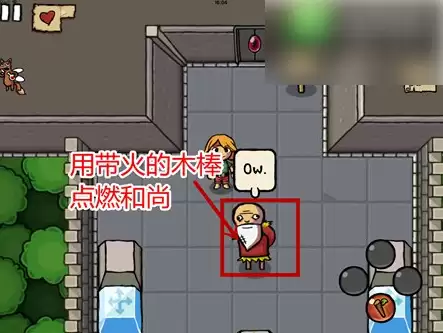 9、移开格子后向前走有个和尚,将带火的木棒点燃和尚,稍后他会被烧死,他身后的门就会打开了;进去一直走就会到一个商人那,那就通关咯,他会将我们送到下个地图里。