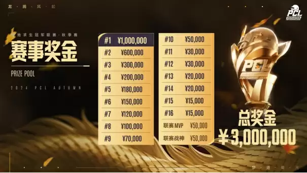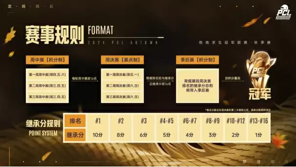 值得一提的是,本次PCL2024秋季赛的赛制,再次进行了一些调整,以无缝对接末PGC的比赛环境。赛事依然会分为常规赛(周中赛+周决赛)及季后赛两大阶段,周中赛与季后赛采用积分制,而周决赛则采用紧张刺激的赛点吃鸡制,主要是通过周决赛来模拟出PGC的赛点吃鸡制,为年末的国际舞台之战打下基础。
