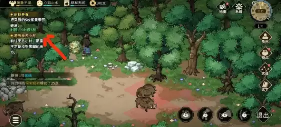 去迷踪林找灵芝,灵芝有两朵,一朵在红色树下,需要打五只野猪才能拿到,一朵在森林中去大野猪的路上,建议早点去拿,晚了可能就没了。